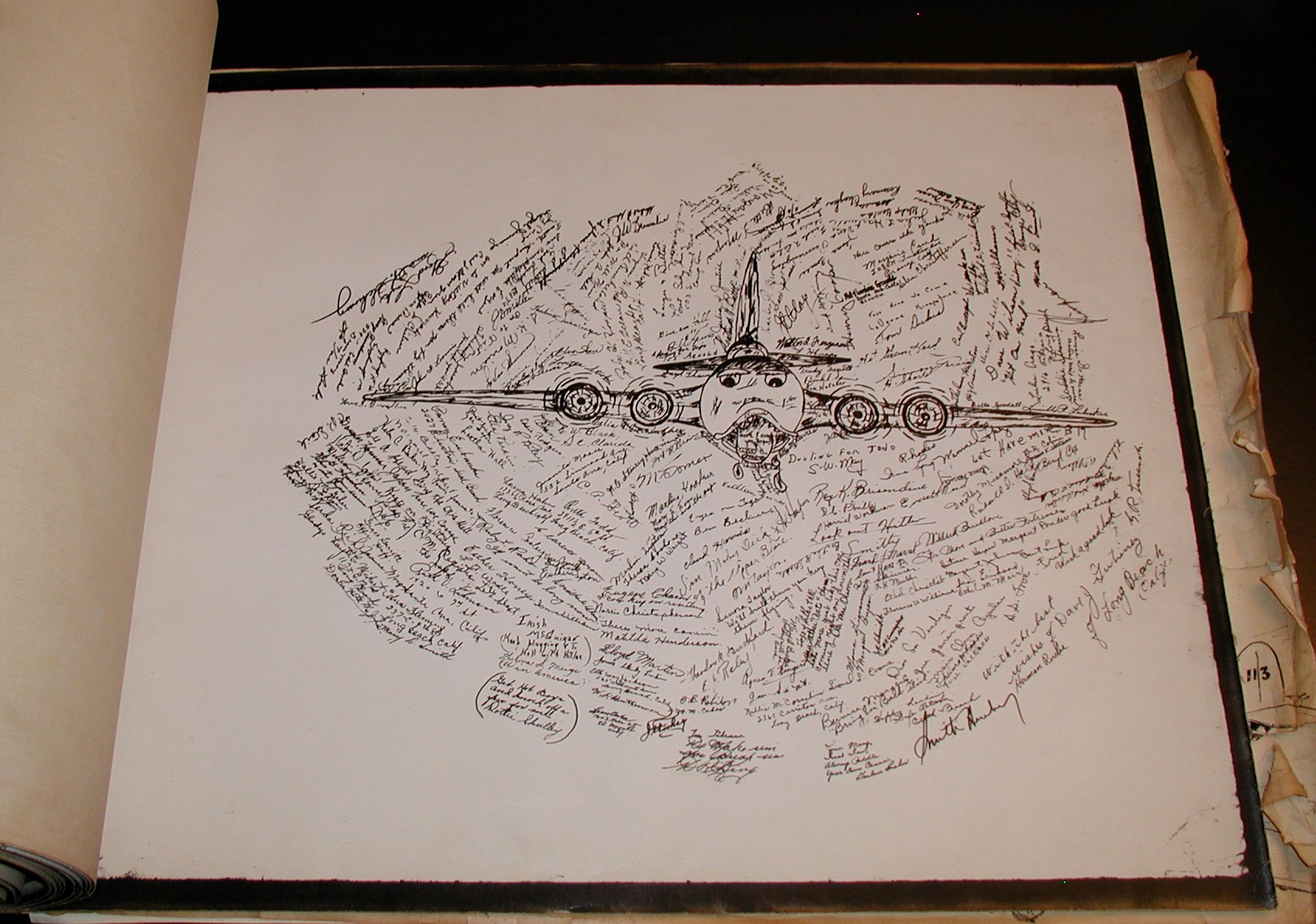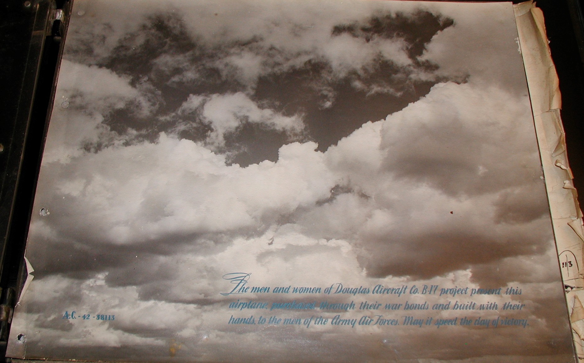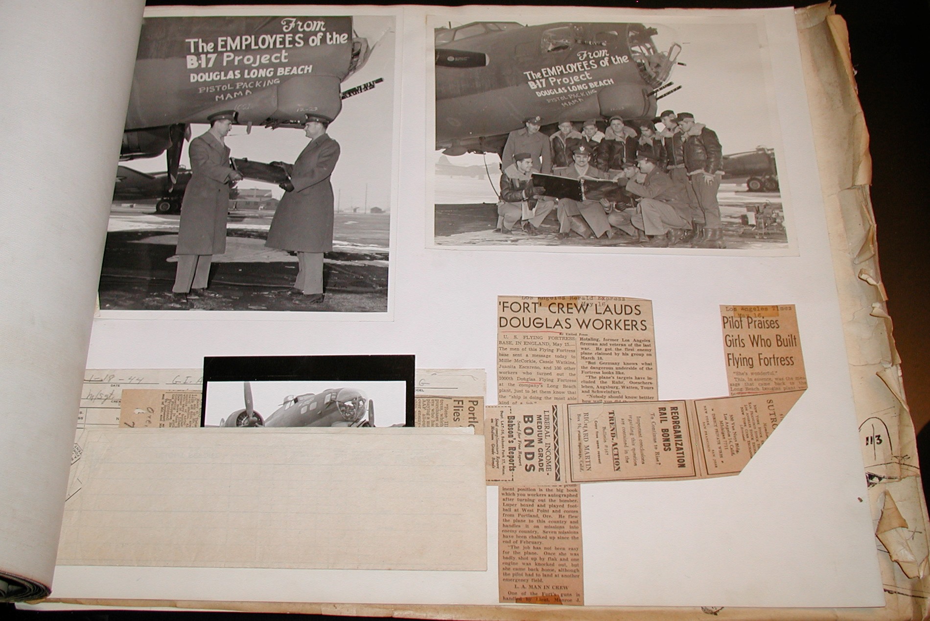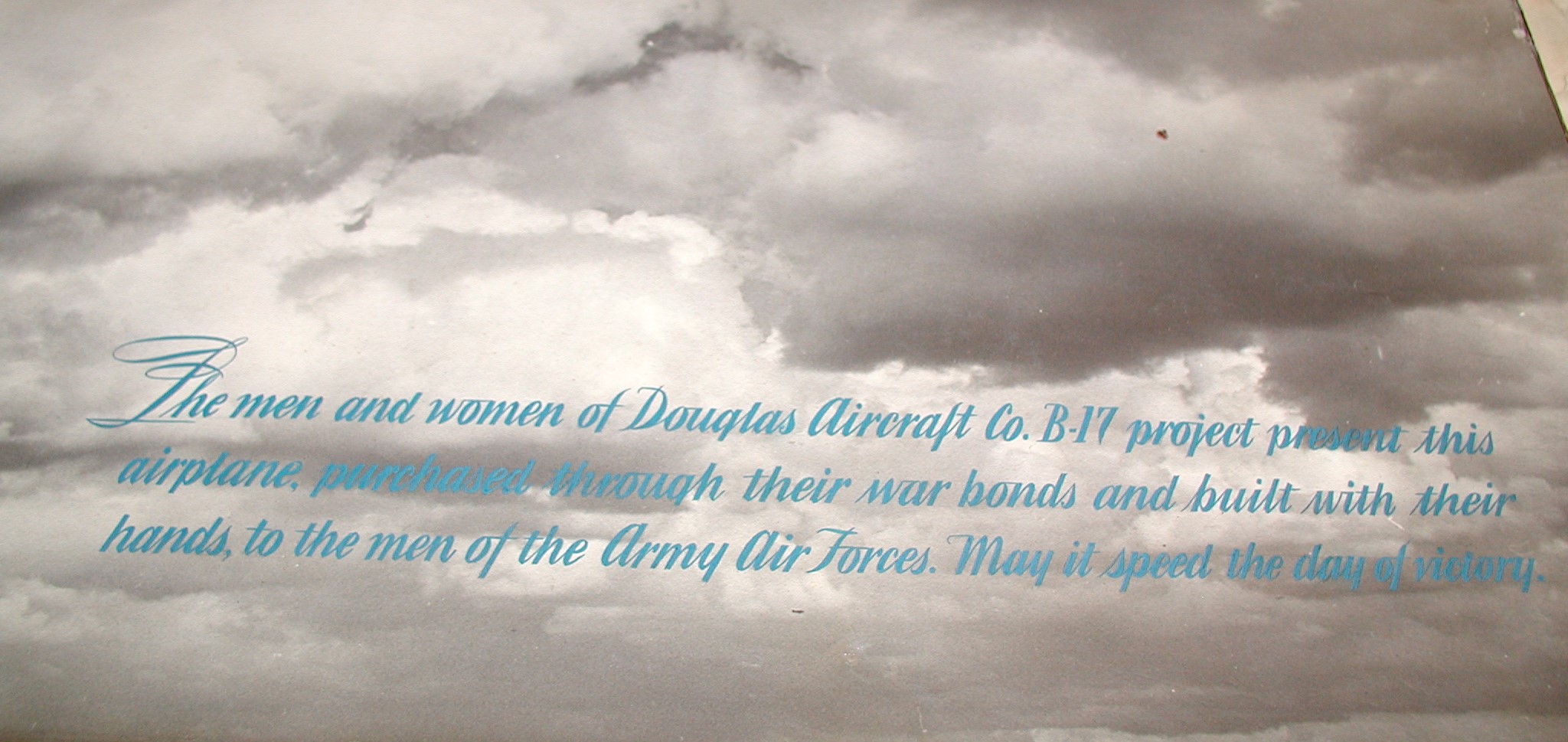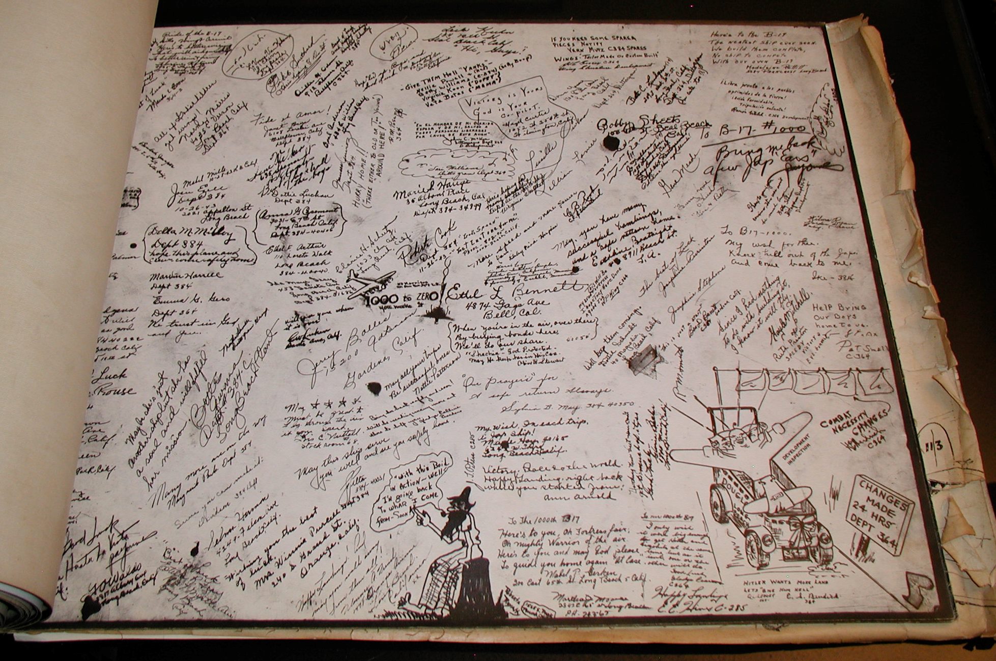 Late 1943 the Douglas Long Beach plant produced it’s 1000th B-17 bomber model G. The workers of the Douglas plant all payed for this special plane by bying war bonds. A book was made with photos, newspaper clippings about the plane and all the Douglas plant workers signed the book.