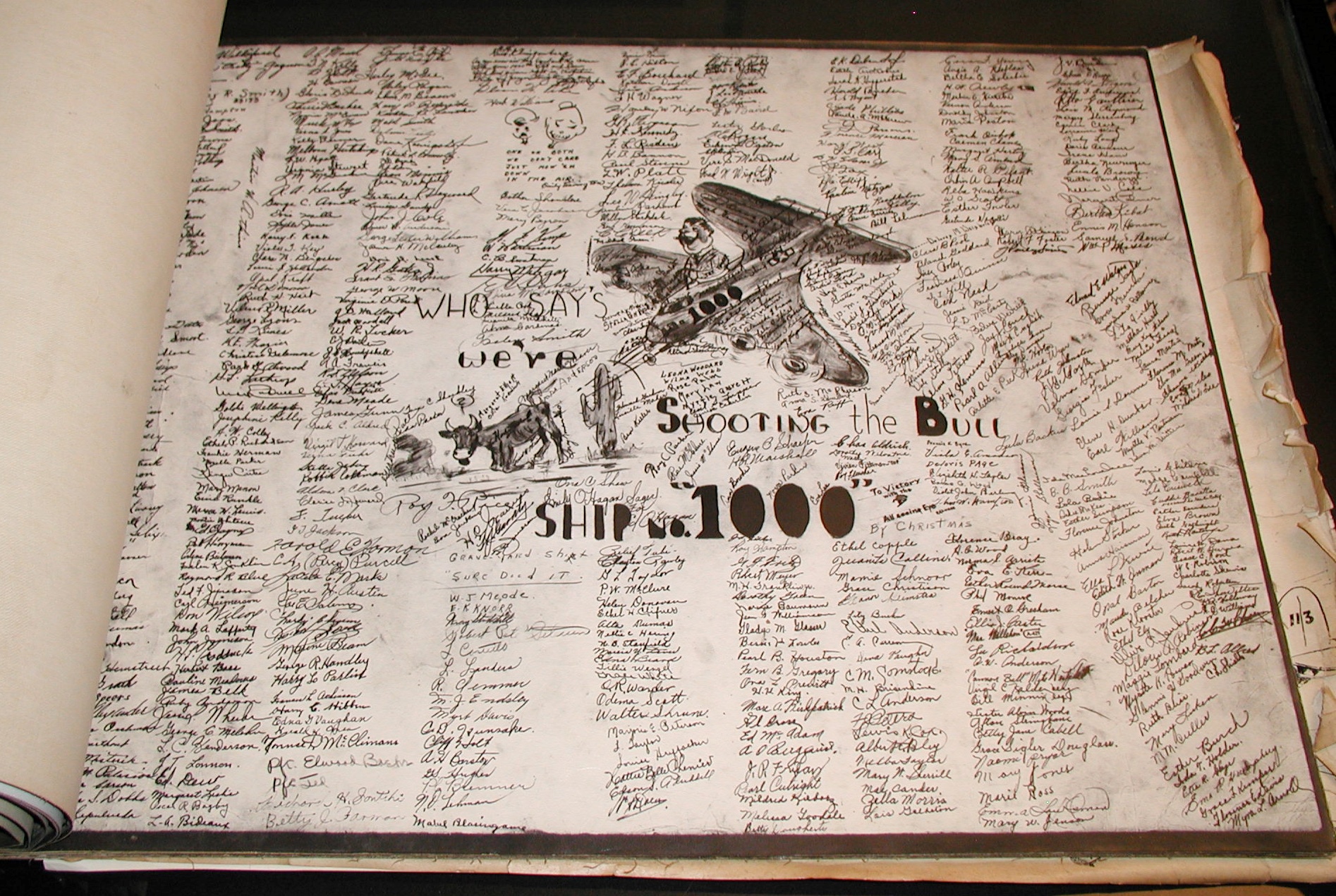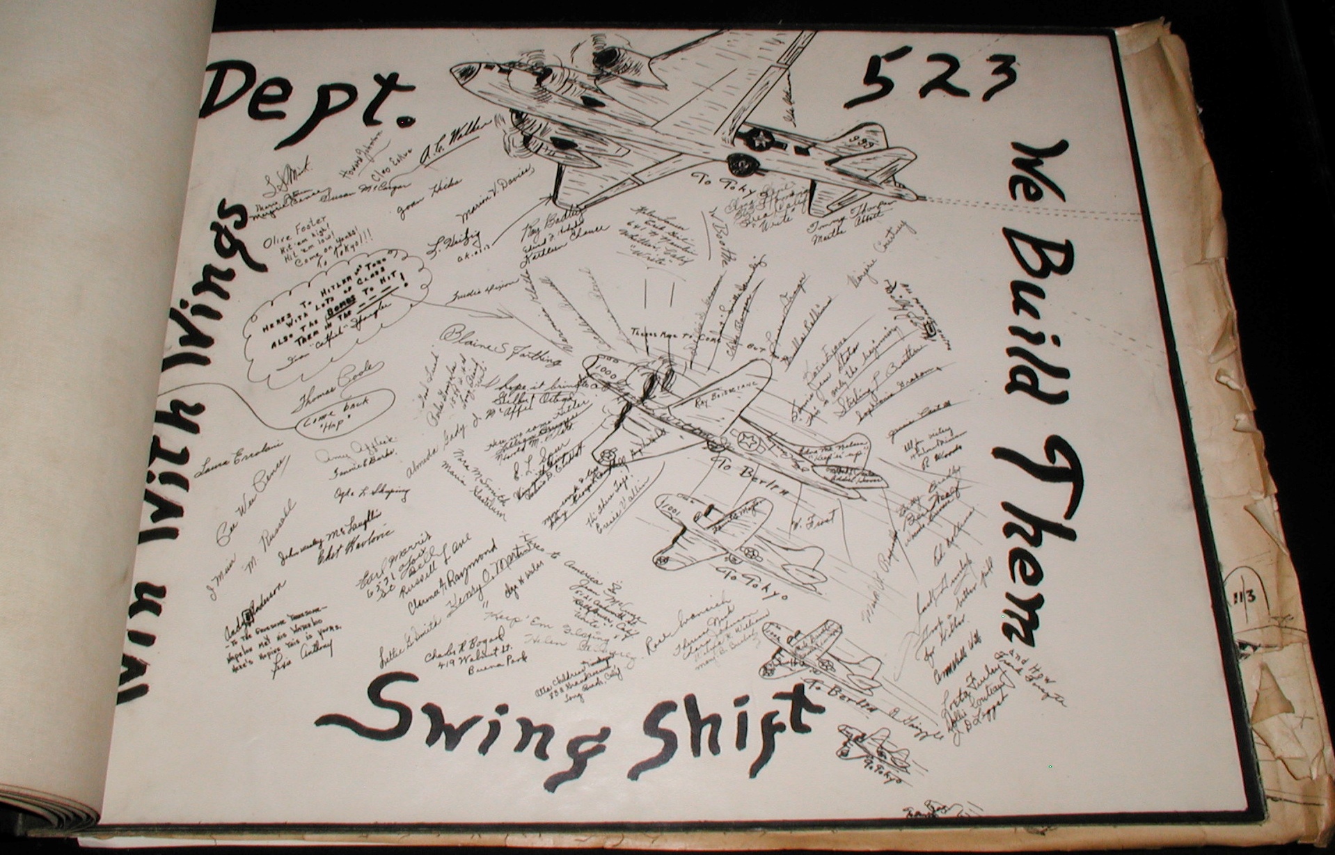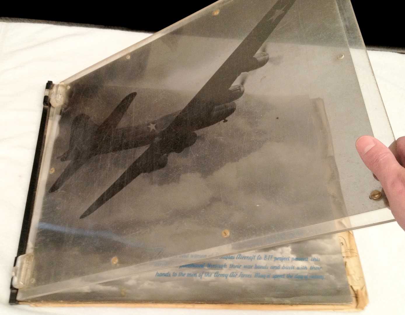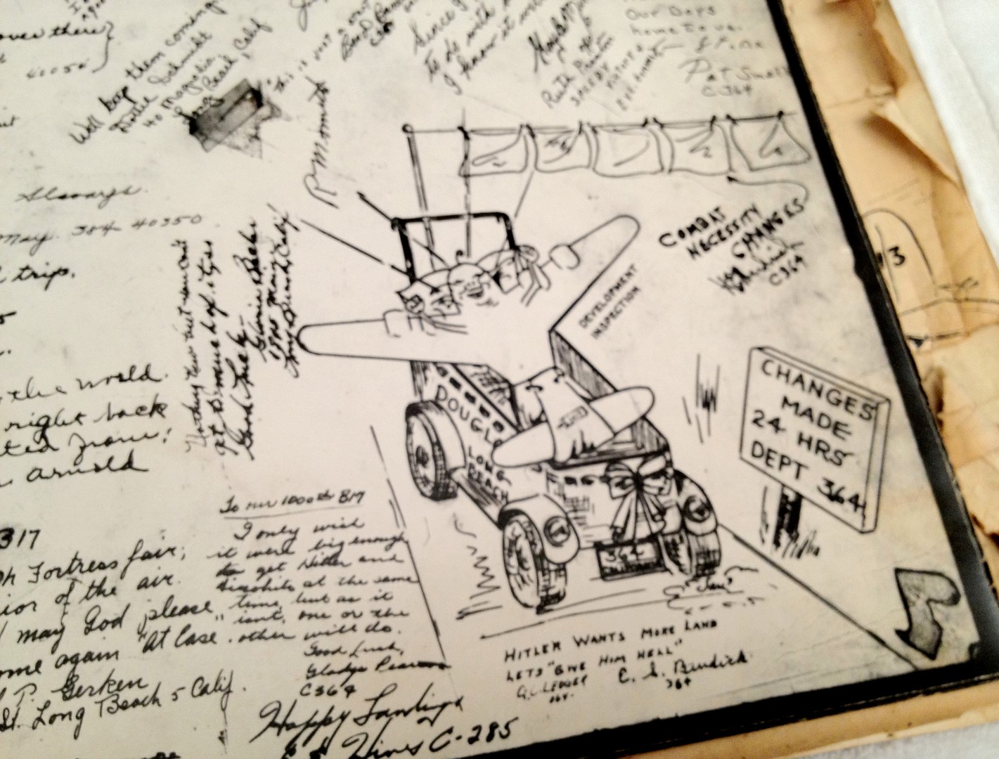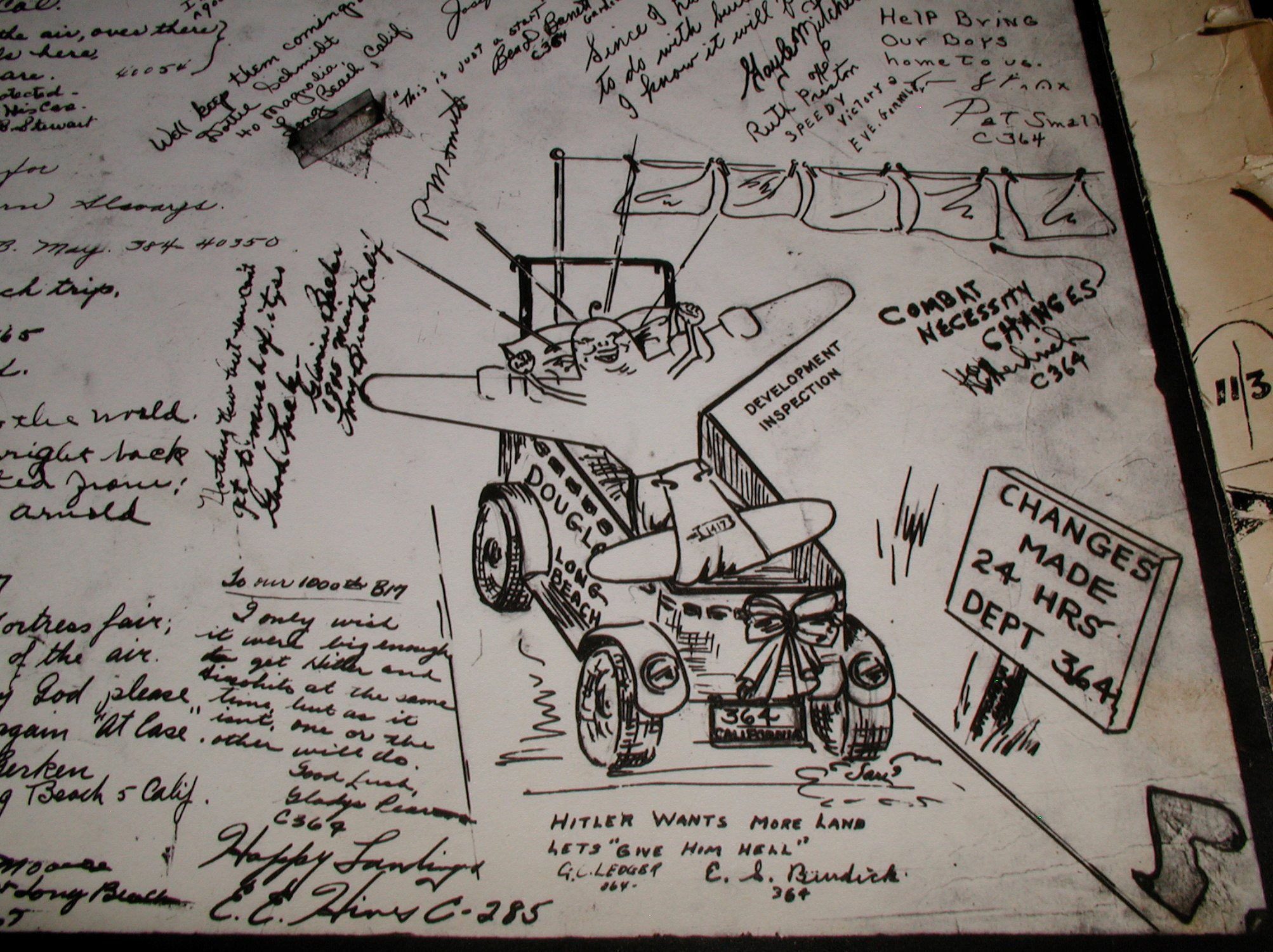Late 1943 the Douglas Long Beach plant produced it’s 1000th B-17 bomber model G. The workers of the Douglas plant all payed for this special plane by bying war bonds. A book was made with photos, newspaper clippings about the plane and all the Douglas plant workers signed the book.
