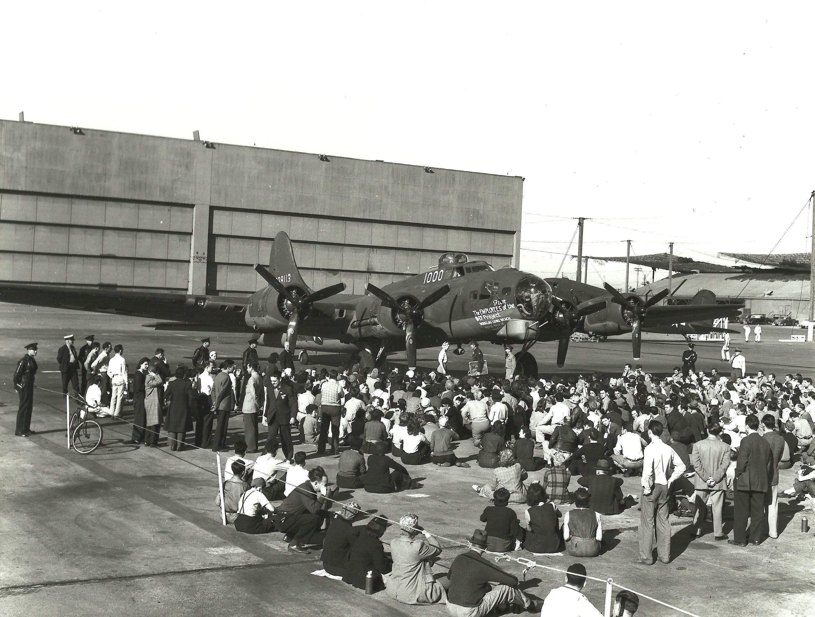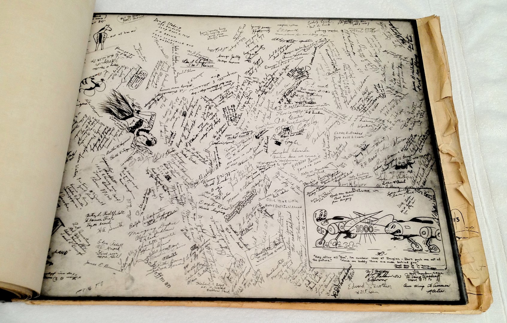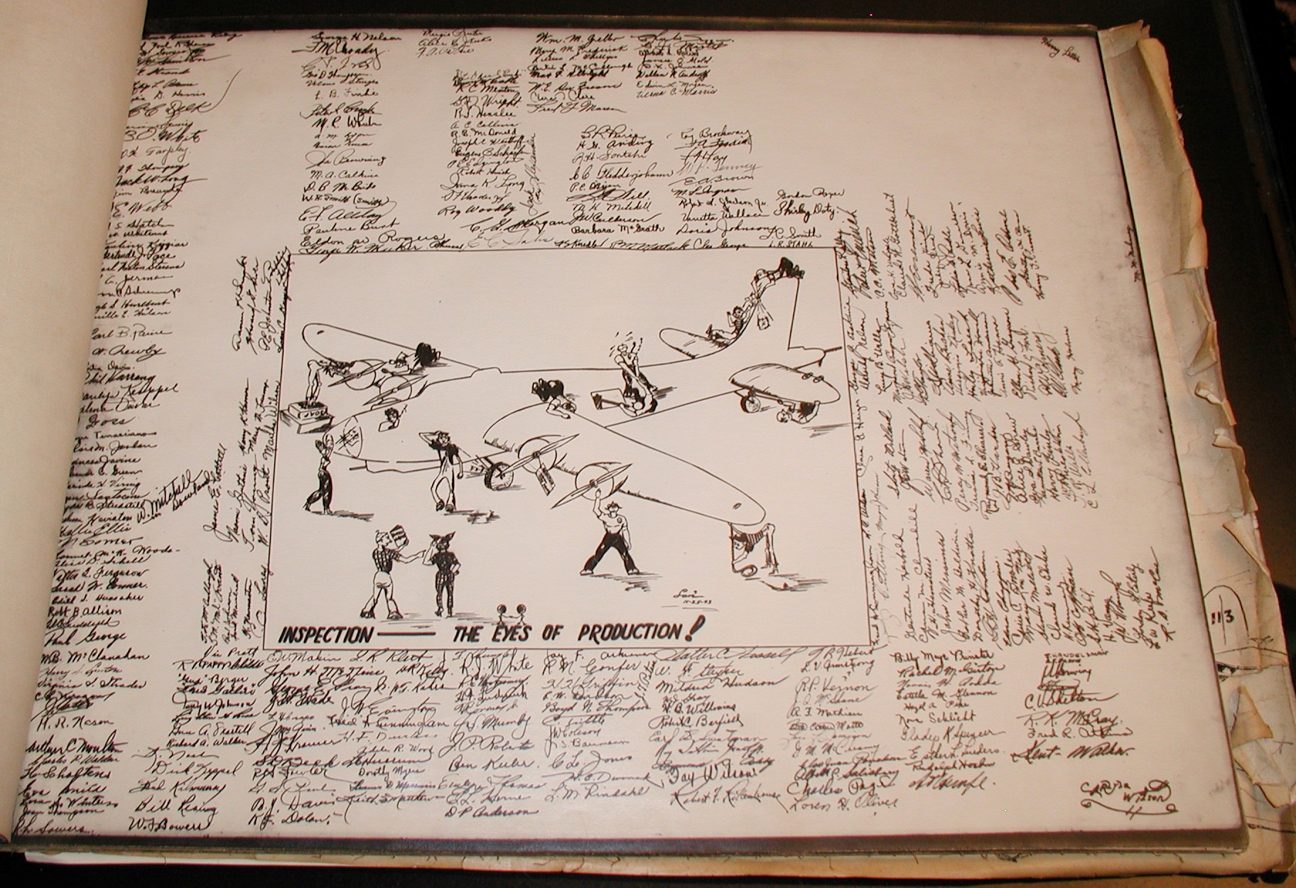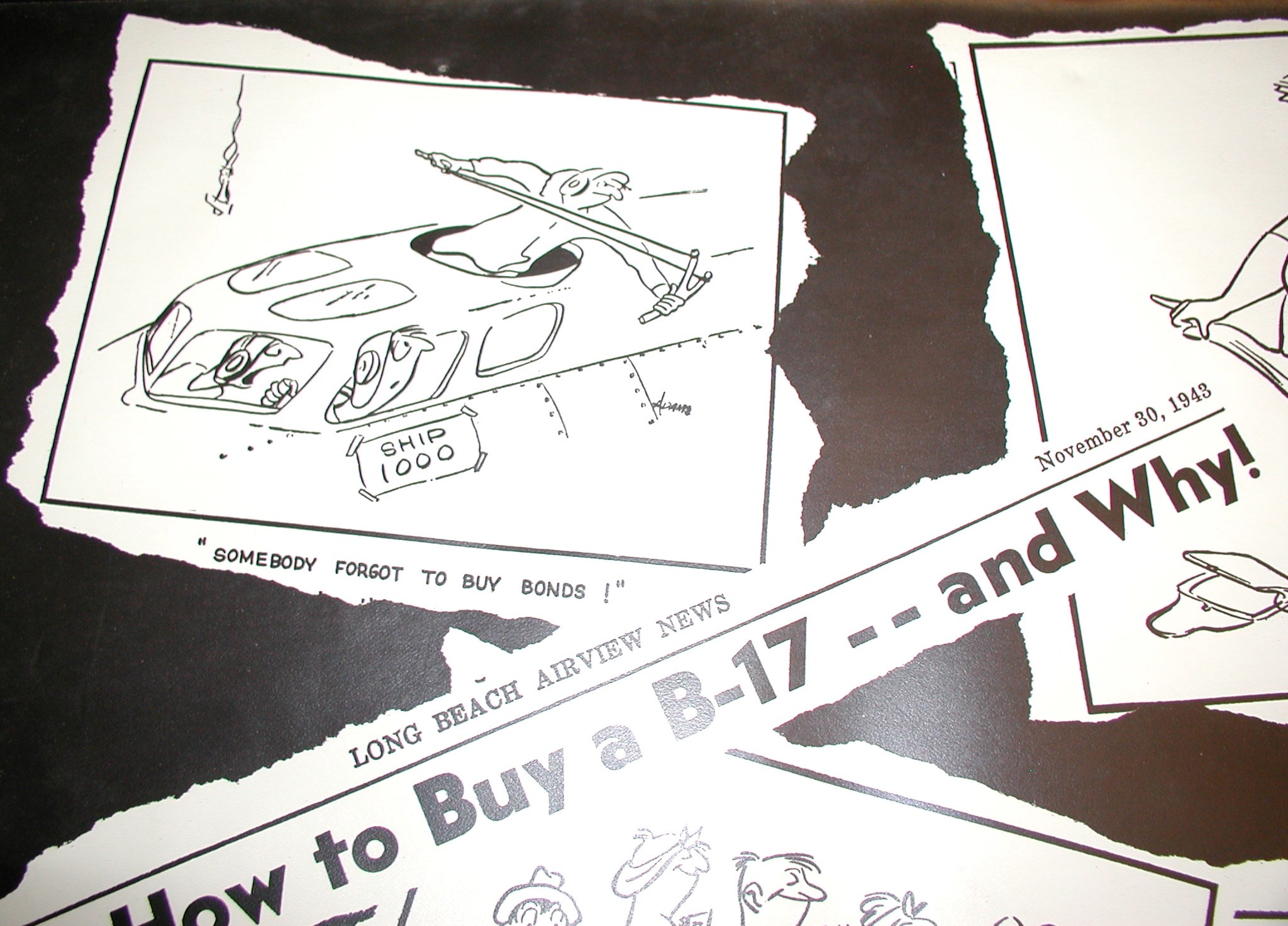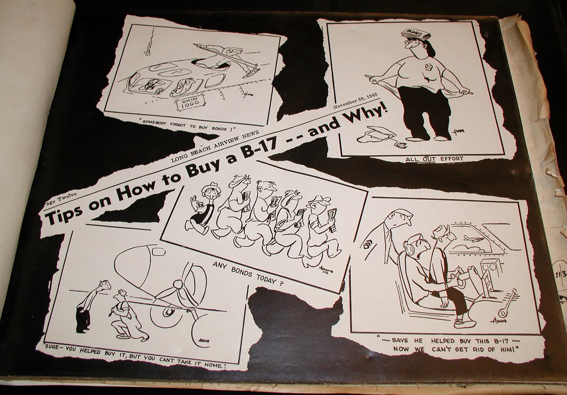 Late 1943 the Douglas Long Beach plant produced it’s 1000th B-17 bomber model G. The workers of the Douglas plant all payed for this special plane by bying war bonds. A book was made with photos, newspaper clippings about the plane and all the Douglas plant workers signed the book.