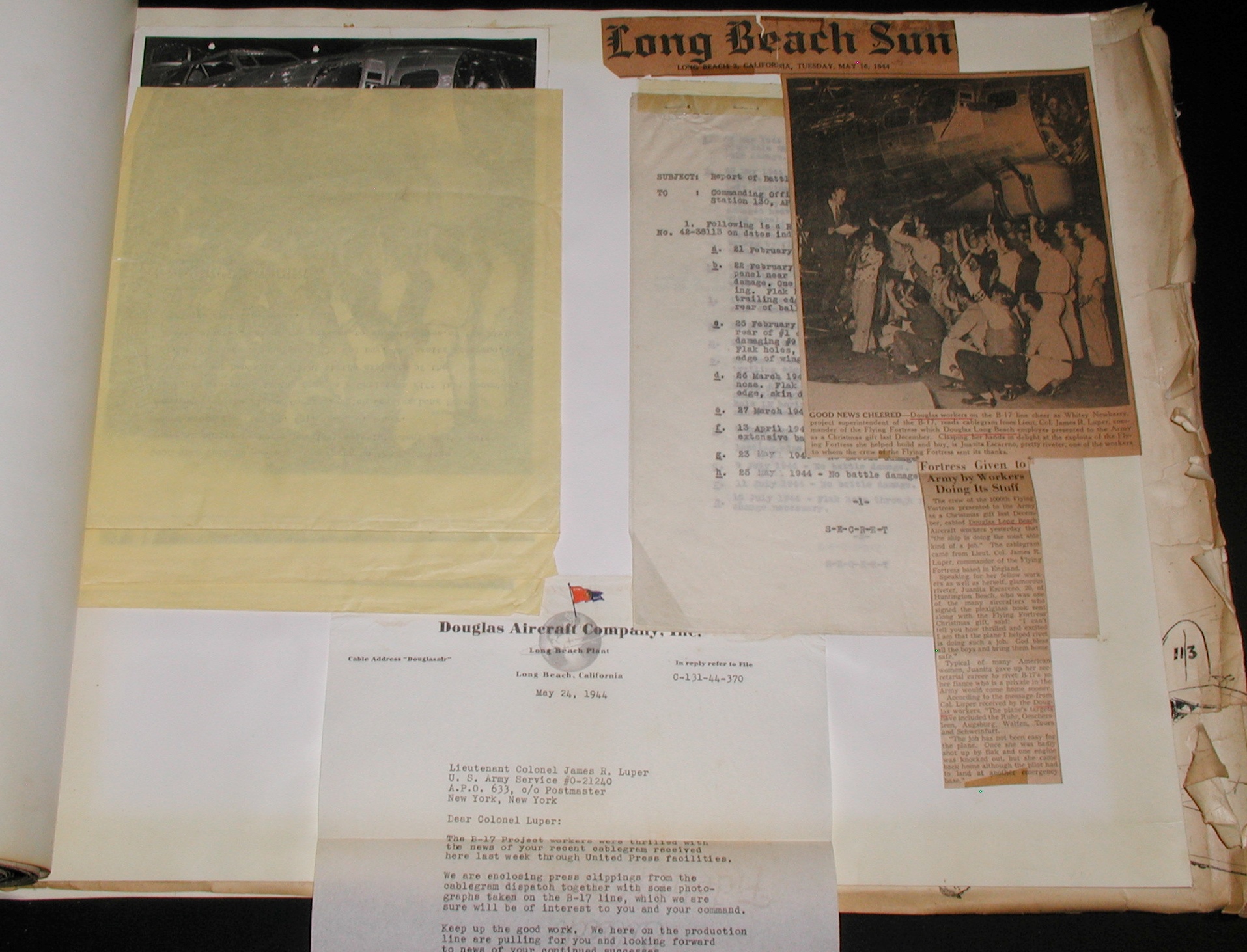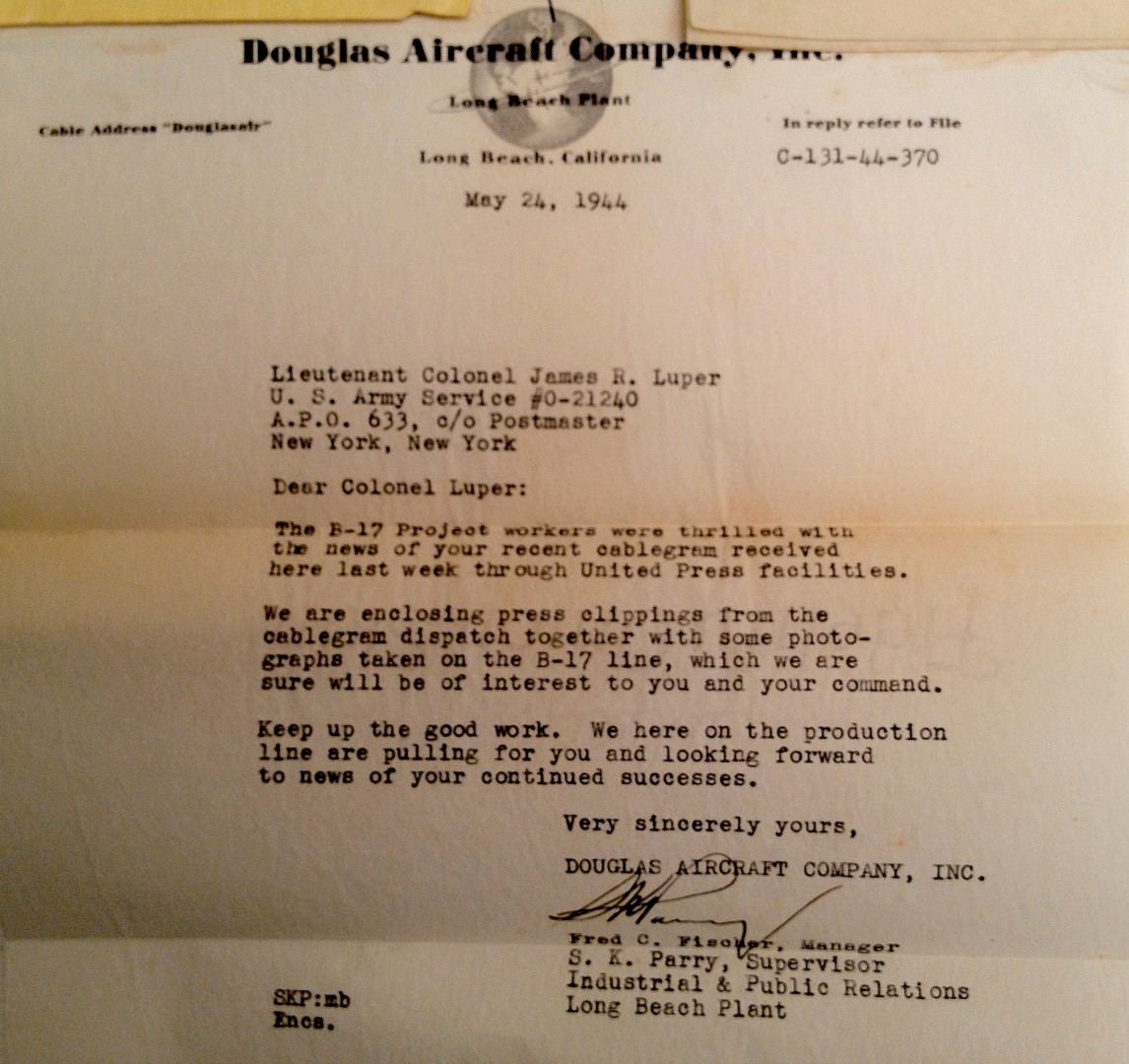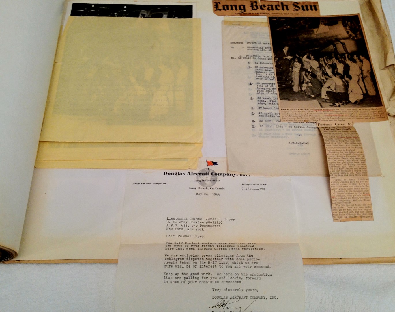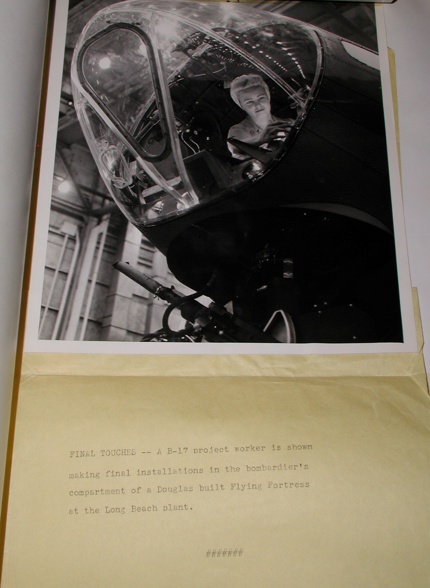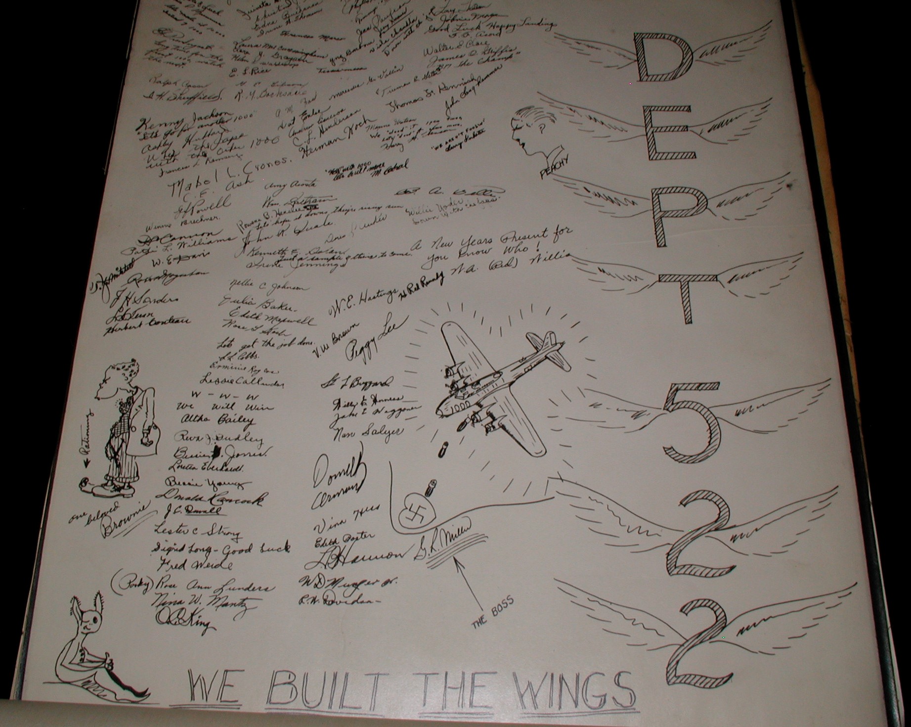 Late 1943 the Douglas Long Beach plant produced it’s 1000th B-17 bomber model G. The workers of the Douglas plant all payed for this special plane by bying war bonds. A book was made with photos, newspaper clippings about the plane and all the Douglas plant workers signed the book.