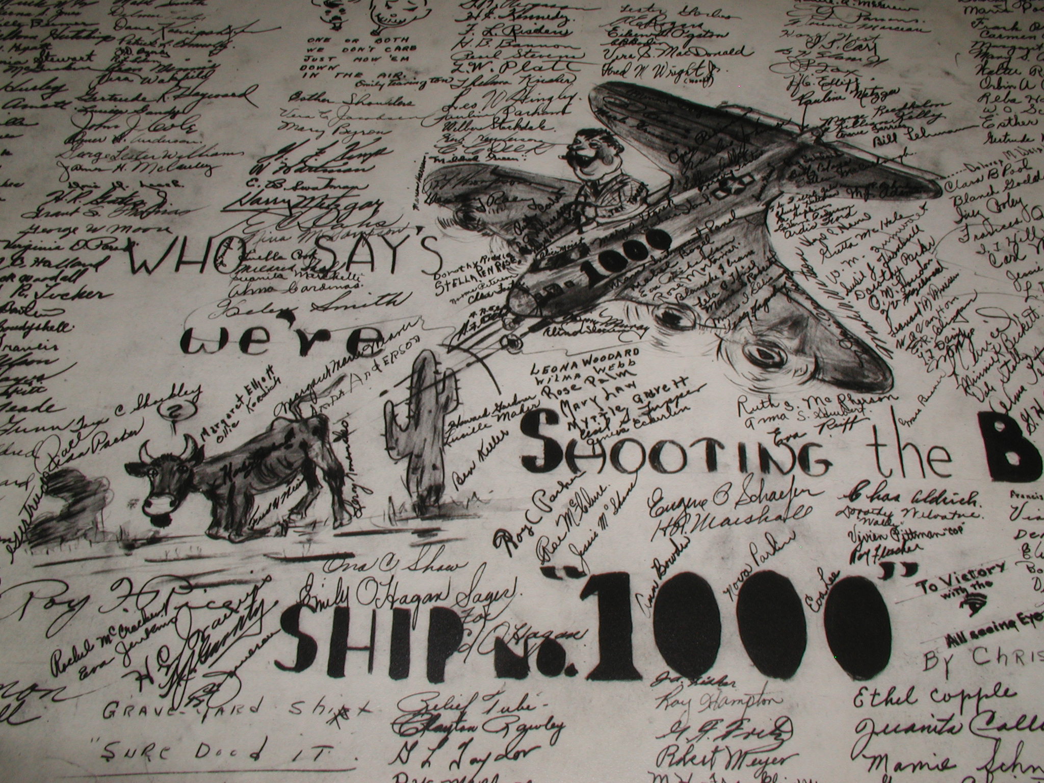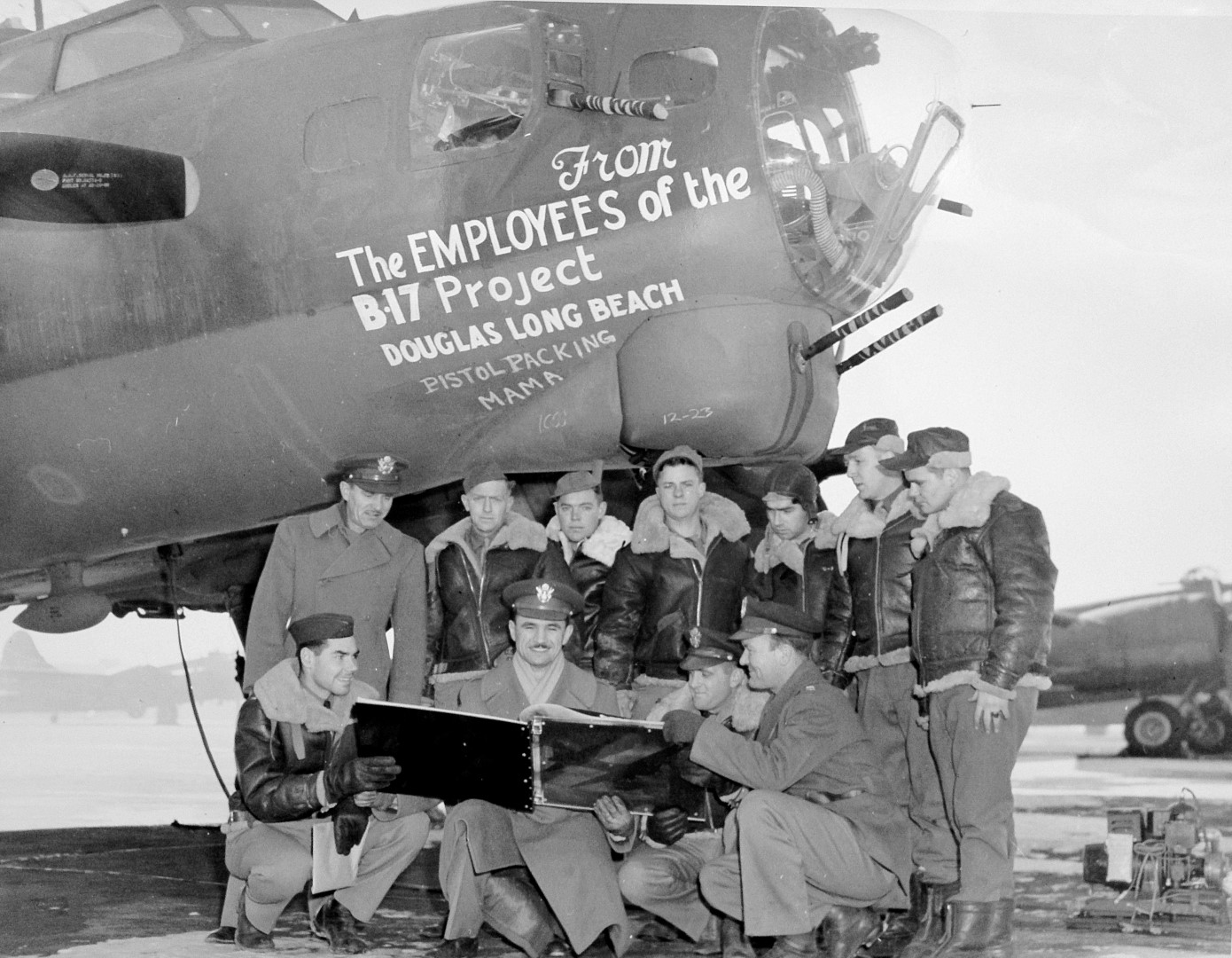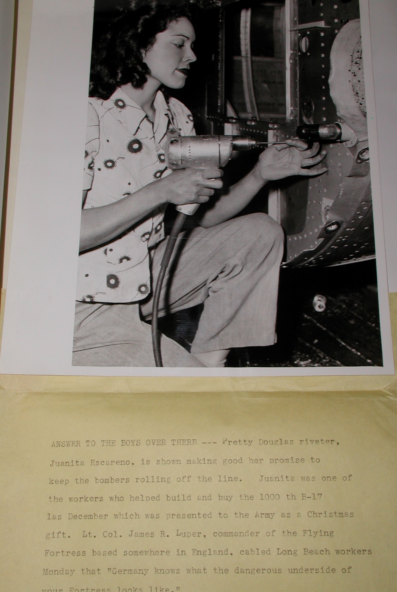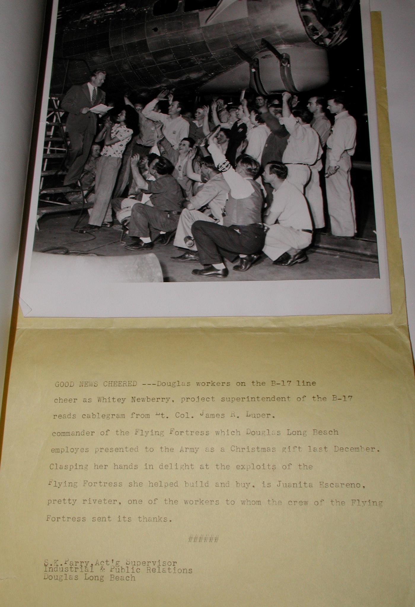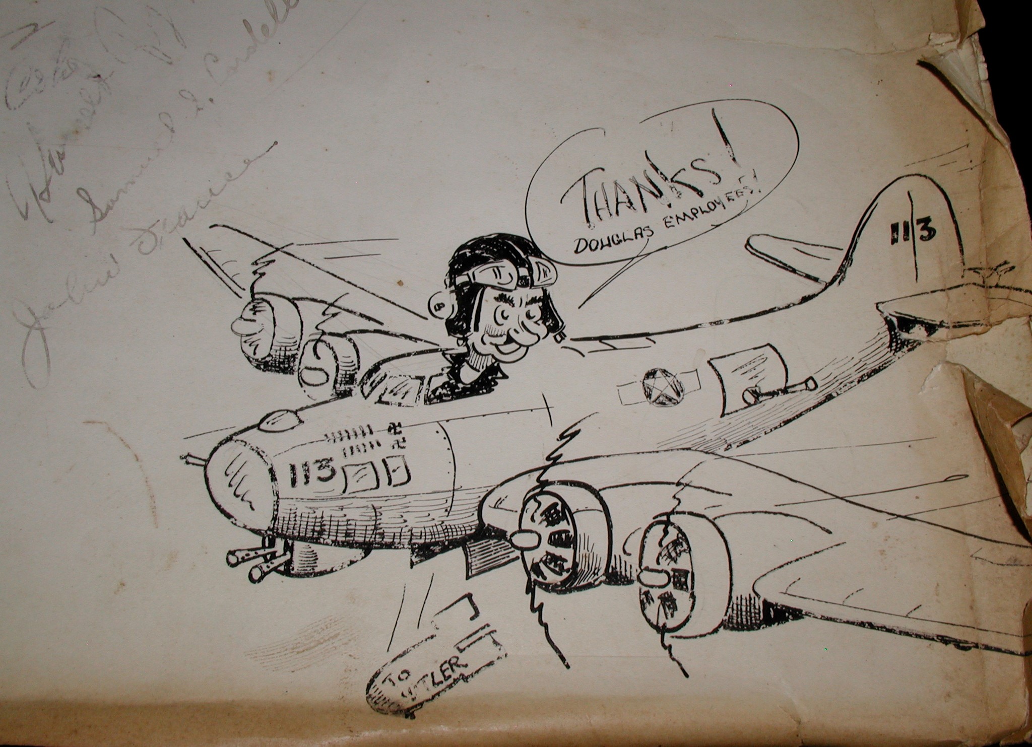 Late 1943 the Douglas Long Beach plant produced it’s 1000th B-17 bomber model G. The workers of the Douglas plant all payed for this special plane by bying war bonds. A book was made with photos, newspaper clippings about the plane and all the Douglas plant workers signed the book.