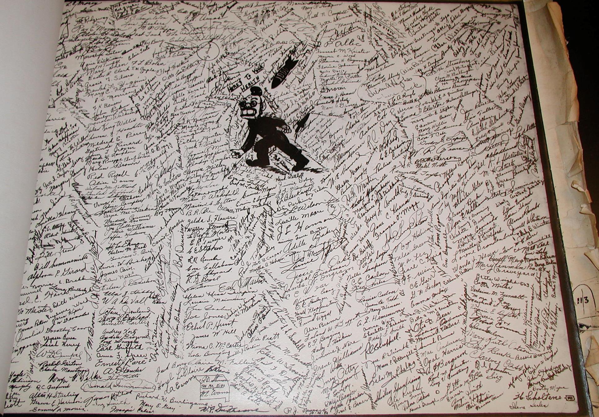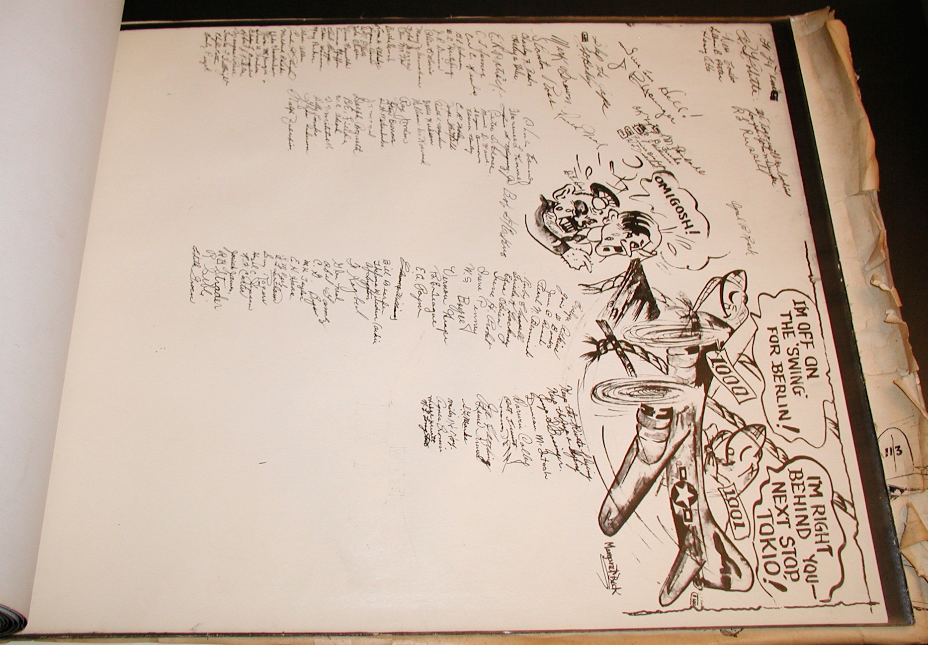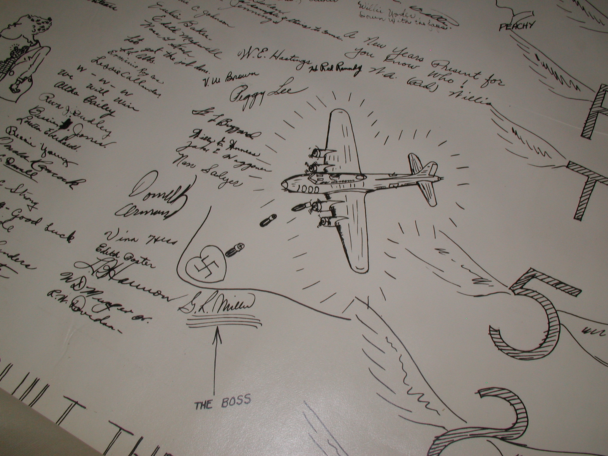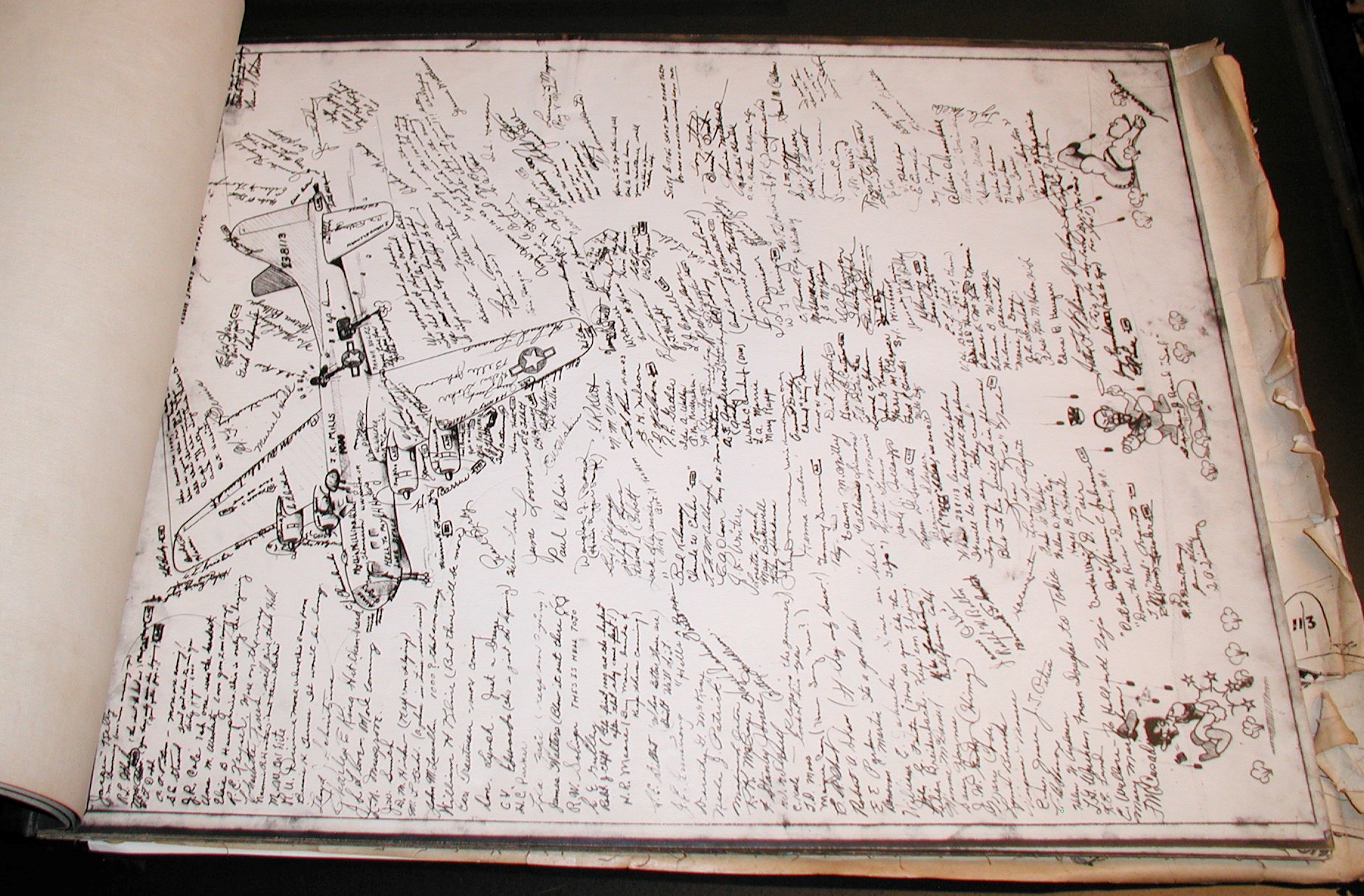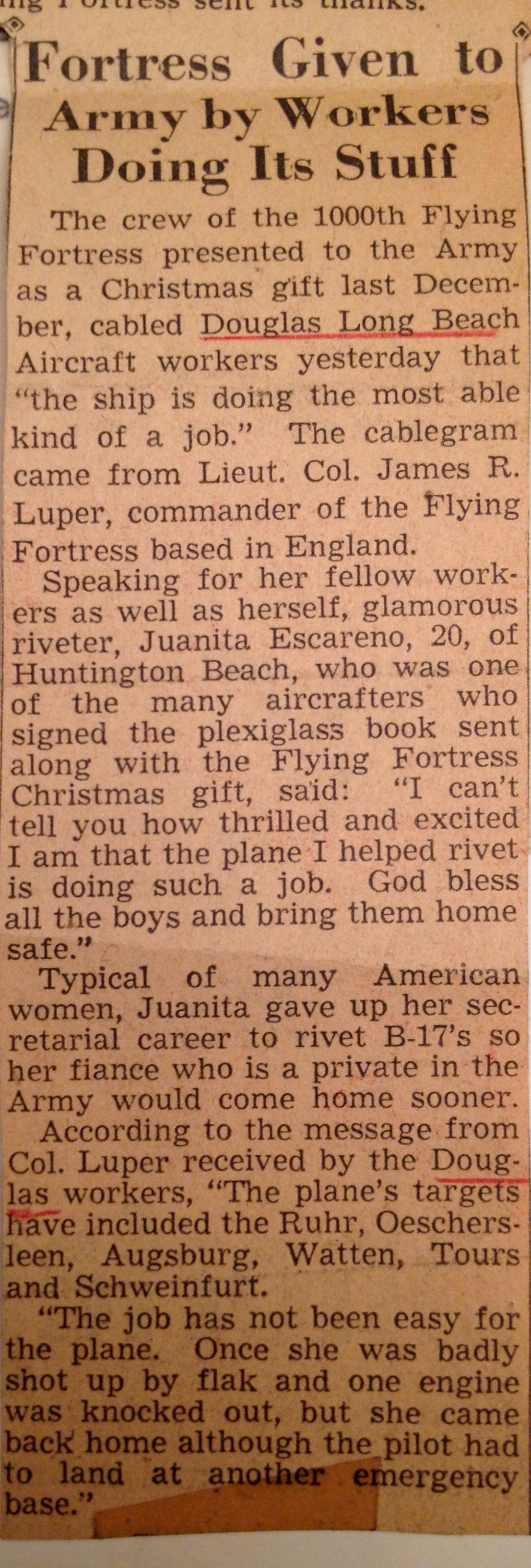 Late 1943 the Douglas Long Beach plant produced it’s 1000th B-17 bomber model G. The workers of the Douglas plant all payed for this special plane by bying war bonds. A book was made with photos, newspaper clippings about the plane and all the Douglas plant workers signed the book.