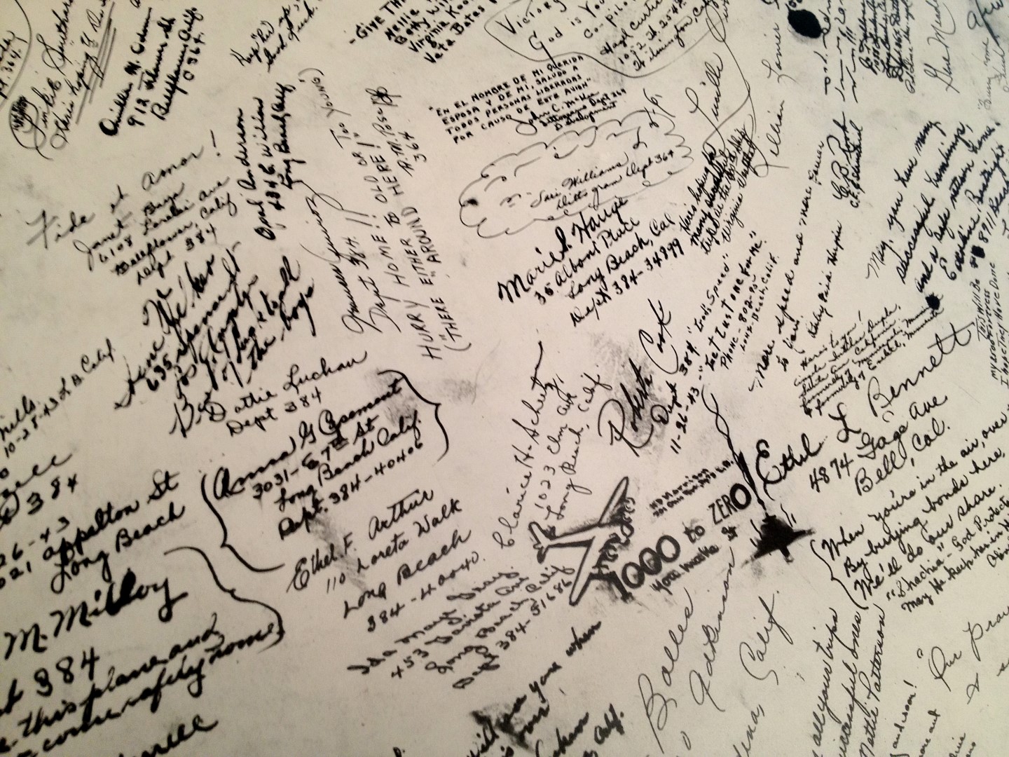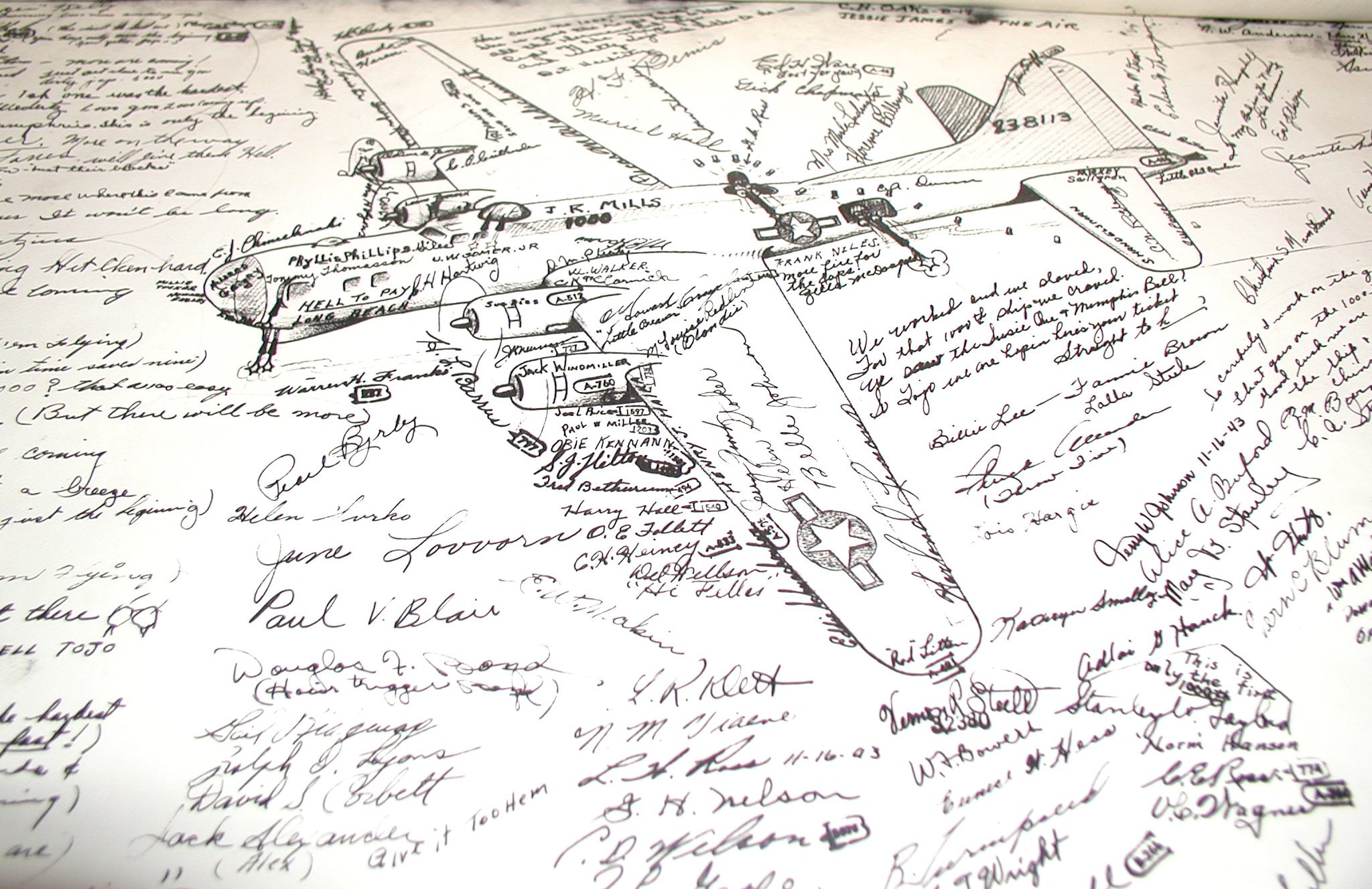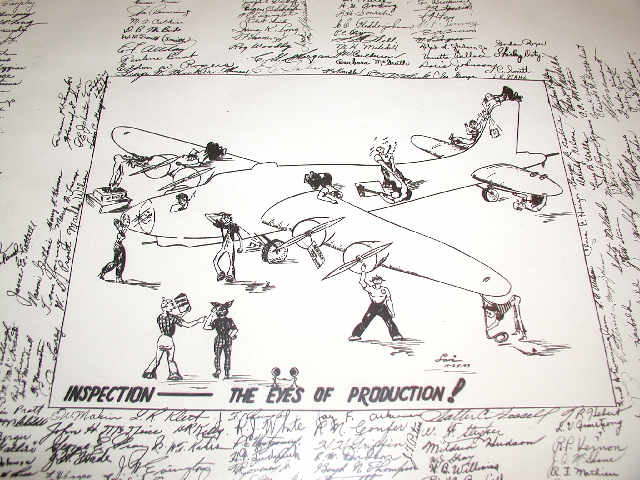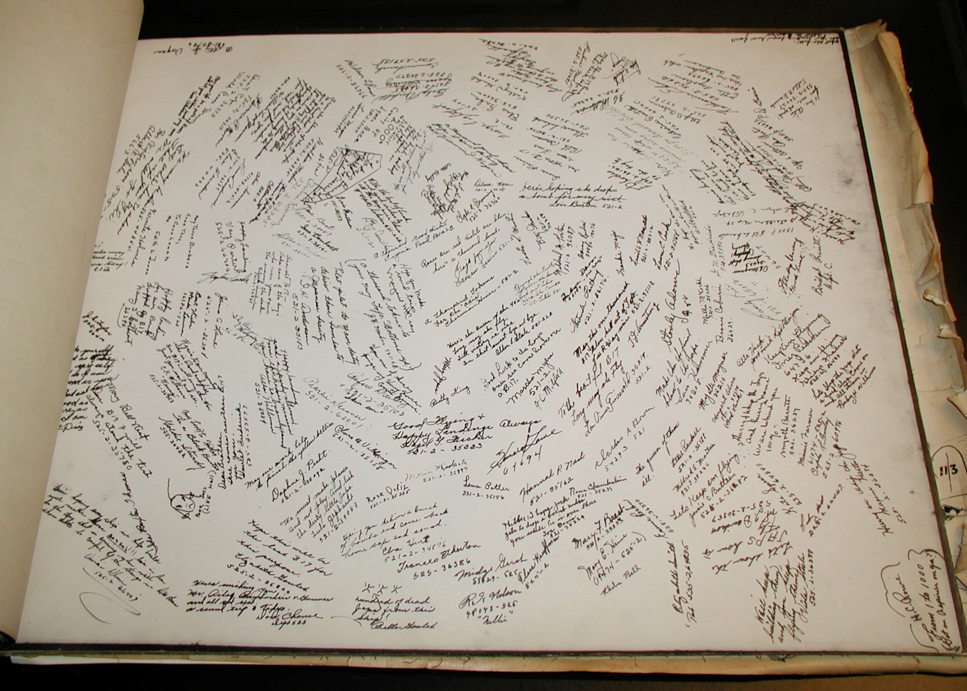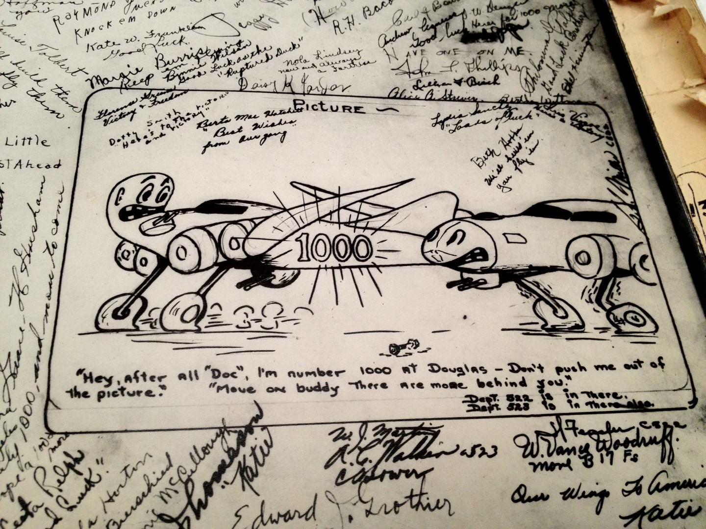 Late 1943 the Douglas Long Beach plant produced it’s 1000th B-17 bomber model G. The workers of the Douglas plant all payed for this special plane by bying war bonds. A book was made with photos, newspaper clippings about the plane and all the Douglas plant workers signed the book.