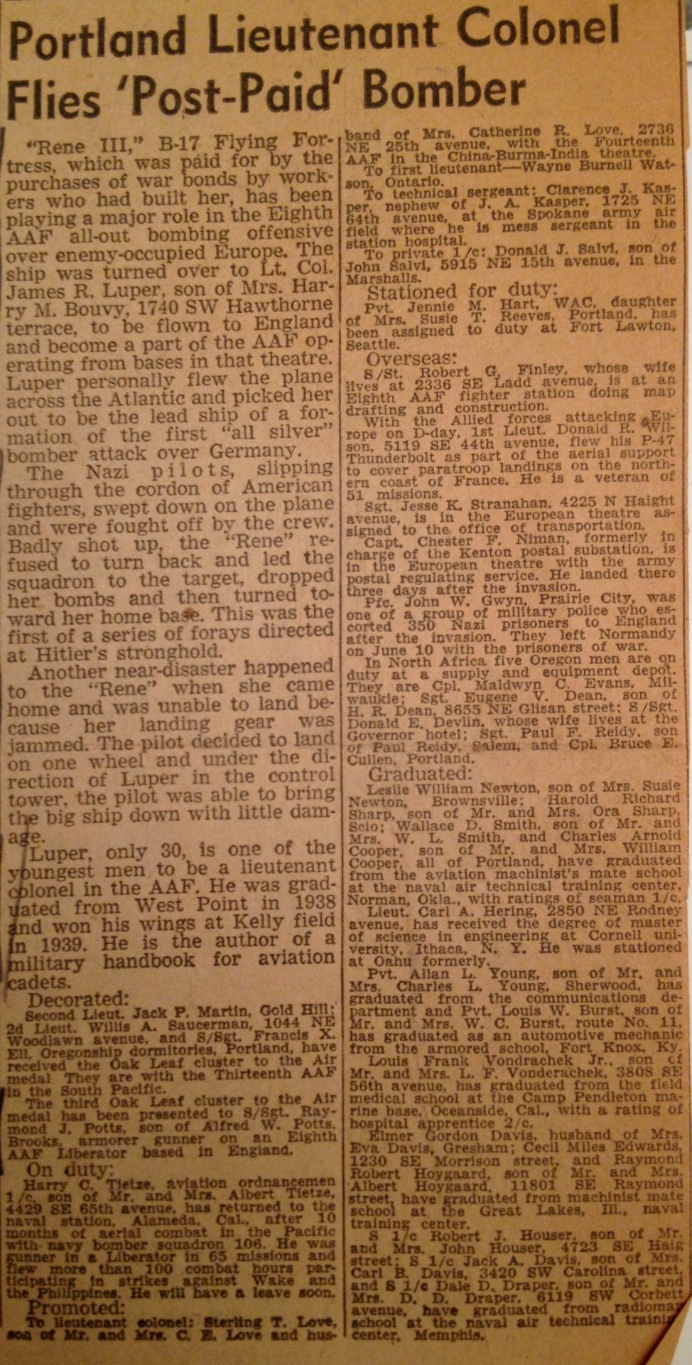 In England the plane was given the name ‘Rene III’ after Lt. Col. Lupers wife. The plane flew many missions during the war but wouldn’t survive the war. Misison No.214, on March 21st 1945 she was lost over Hopsten when she was fatally hit by FLAK and crashed. Luckily almost everybody survived the crash.