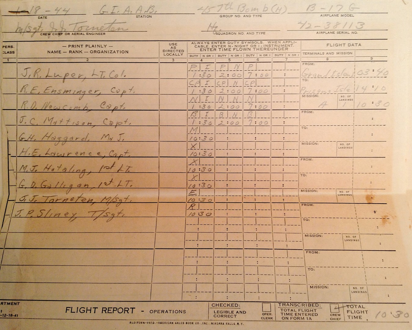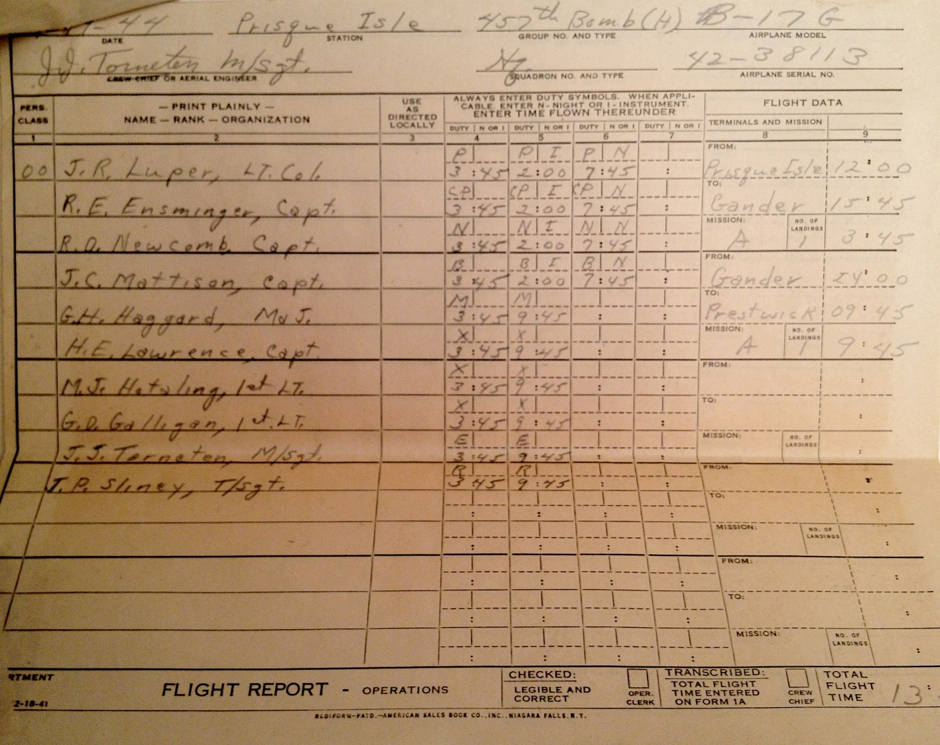 January 19th 1944 from Prisque Isle to Gander and from Gander to Prestwick (Scotland)