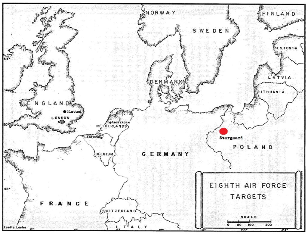 Overcast at the primary (Politz) caused the 457th to attack the secondary target which was an airfield at Stargaard. Led by Lt. Col. Francis with Lt. Seesenguth as pilot, the thirty-six plane formation, comprising the 94th B Combat Wing, took off in early morning. Assembly and route to the target was as briefed, other than to allow the 1st A Combat Wing (flying parallel to the left and out of position) to move ahead in order to prevent any difficulties on the bomb run.