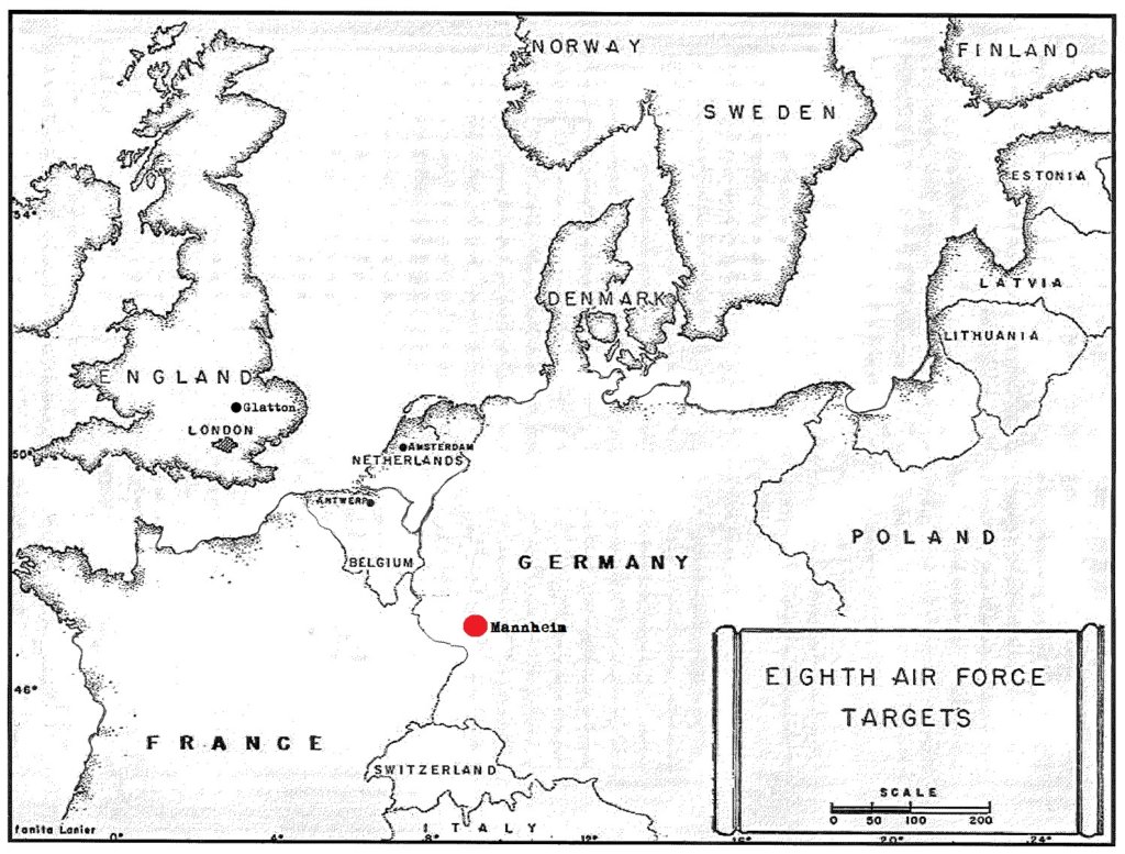 The 457th flew as the 94th A Combat Wing attacking the tank component and gun tractor works at Mannheim. Thirty-six craft were led by Lt. Col. Wilson. Assembly was 1,000 feet above briefed altitude because of weather, but the route over England was flown as briefed. After flying the Division assembly line on course and in proper position, the Group proceeded to the vicinity of Mons, Belgium. There the entire formation began to deviate south of course and the Group followed in Division formation.