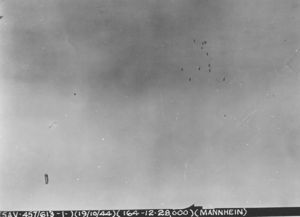 The Group attacked Mannheim on a combined visual and PFF run. The turn was made southeast of the briefed IP. Check points to the target were only partially obscured, but the target area was covered by ten-tenths clouds. With the PFF equipment of the lead and low squadrons out, it was planned to drop bombs on the smoke markers of the high box. The low squadron released its bombs successfully from 27,500 feet, but the lead craft of the squadron became enveloped in clouds and contrails and had to turn left. As a result, it fell behind the formation. However, the Deputy Lead sighted the smoke markers and eight aircraft of the lead squadron released on them. The whole lead squadron then made a second run in order to allow the other three aircraft to drop their bombs.