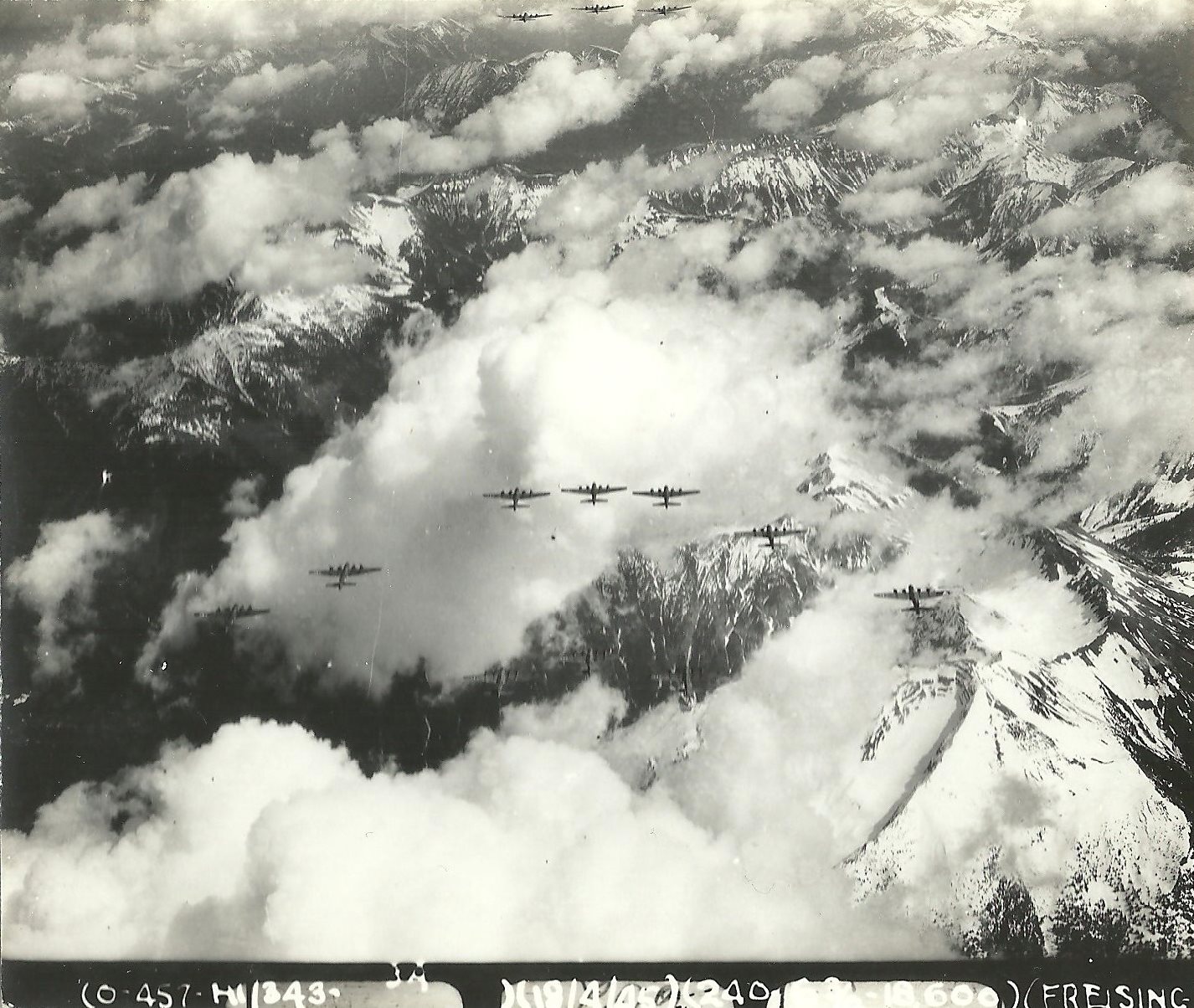 A run was made on Traunstein, the primary target, but it became obscured again by clouds, and no bombs were released. The Group Leader then ordered squadrons to make a PFF run on the secondary target, Freising, with the low squadron leading, since the PFF equipment of the lead squadron was not operating normally.
