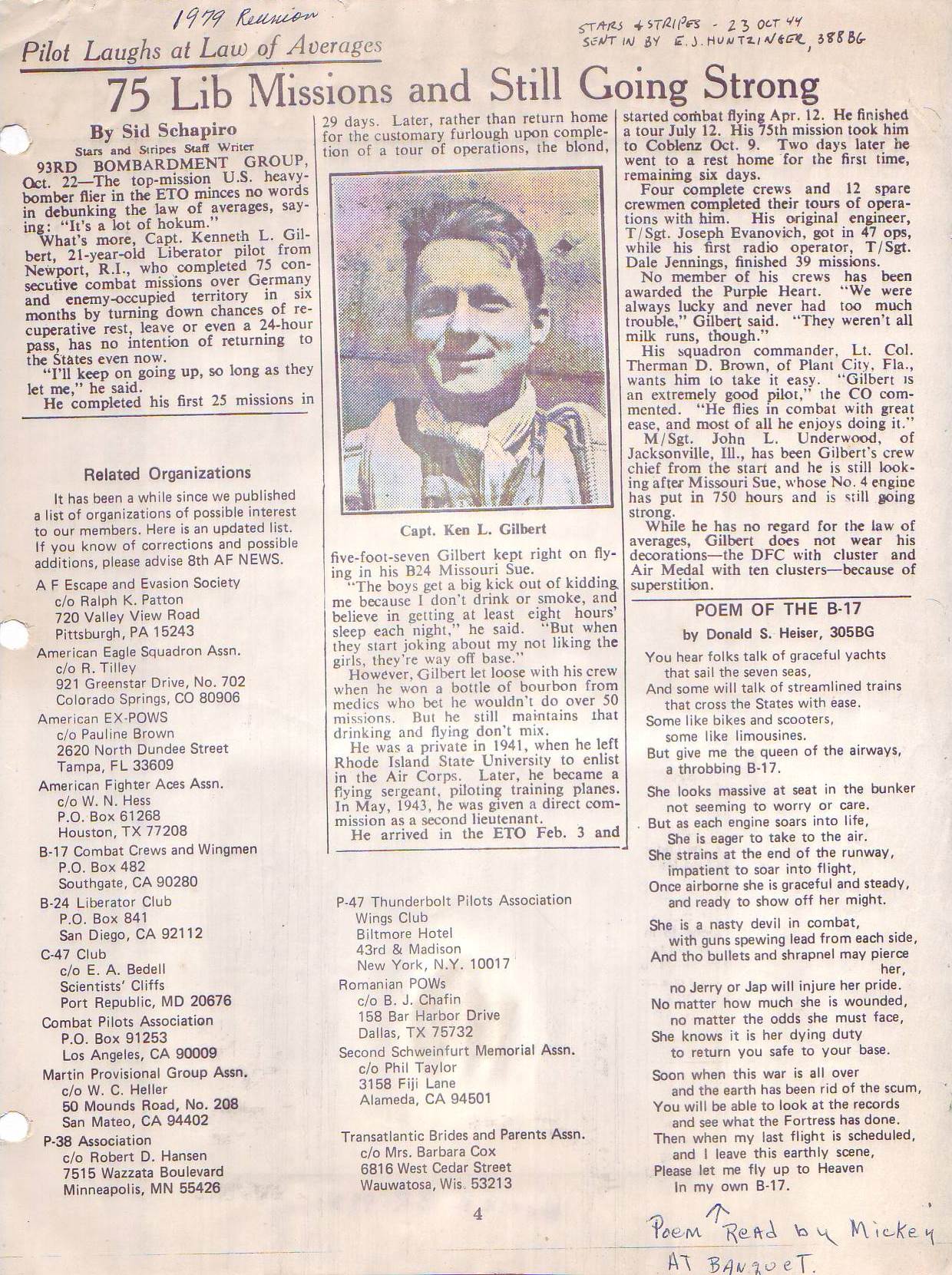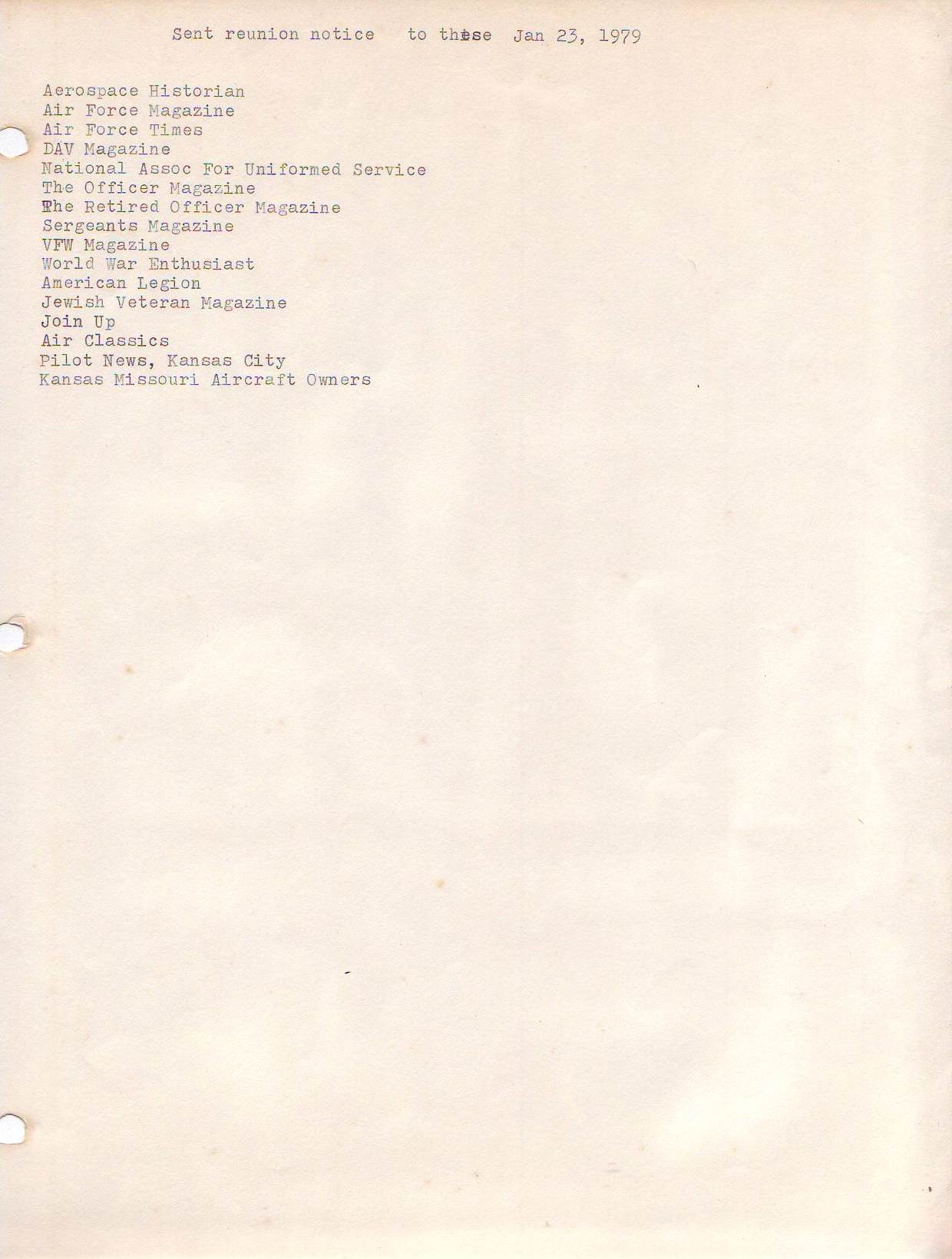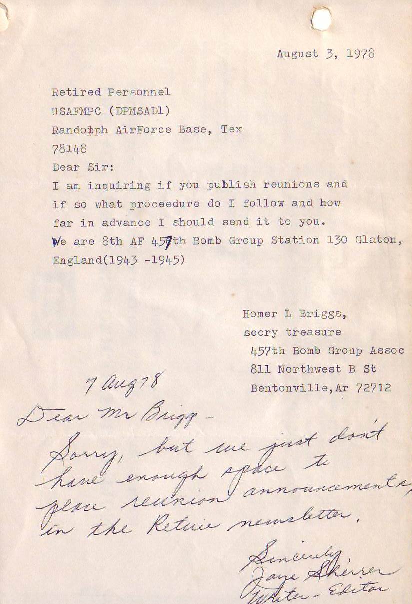 Reunion 1979 Reunion program Reunion attendees Center piece Ken Kinyon 749th men 749th men Banquet Poem Victor F. Halboth Reunion prayer Honor ceremony Group photo 748th men Peterson and Sellon Group photo 749th men Reunion banquet Townsends and Carey Homer Briggs 457th BG women Homer Briggs Holiday Inn flyer Holiday Inn flyer Holiday Inn flyer Holiday Inn flyer Holiday Inn flyer Strategic Aerospace Museum Strategic Aerospace Museum Strategic Aerospace Museum Strategic Aerospace Museum Baines letter part 1 Baines letter part 2 Brown’s cancellation Reunion notices Reunion notices The American Legion The American Legion V.F.W. Magazine Reunion notice DAV Magazine Air Force Historical Foundation Magazine leaflets