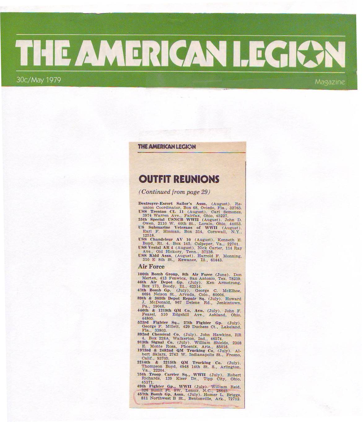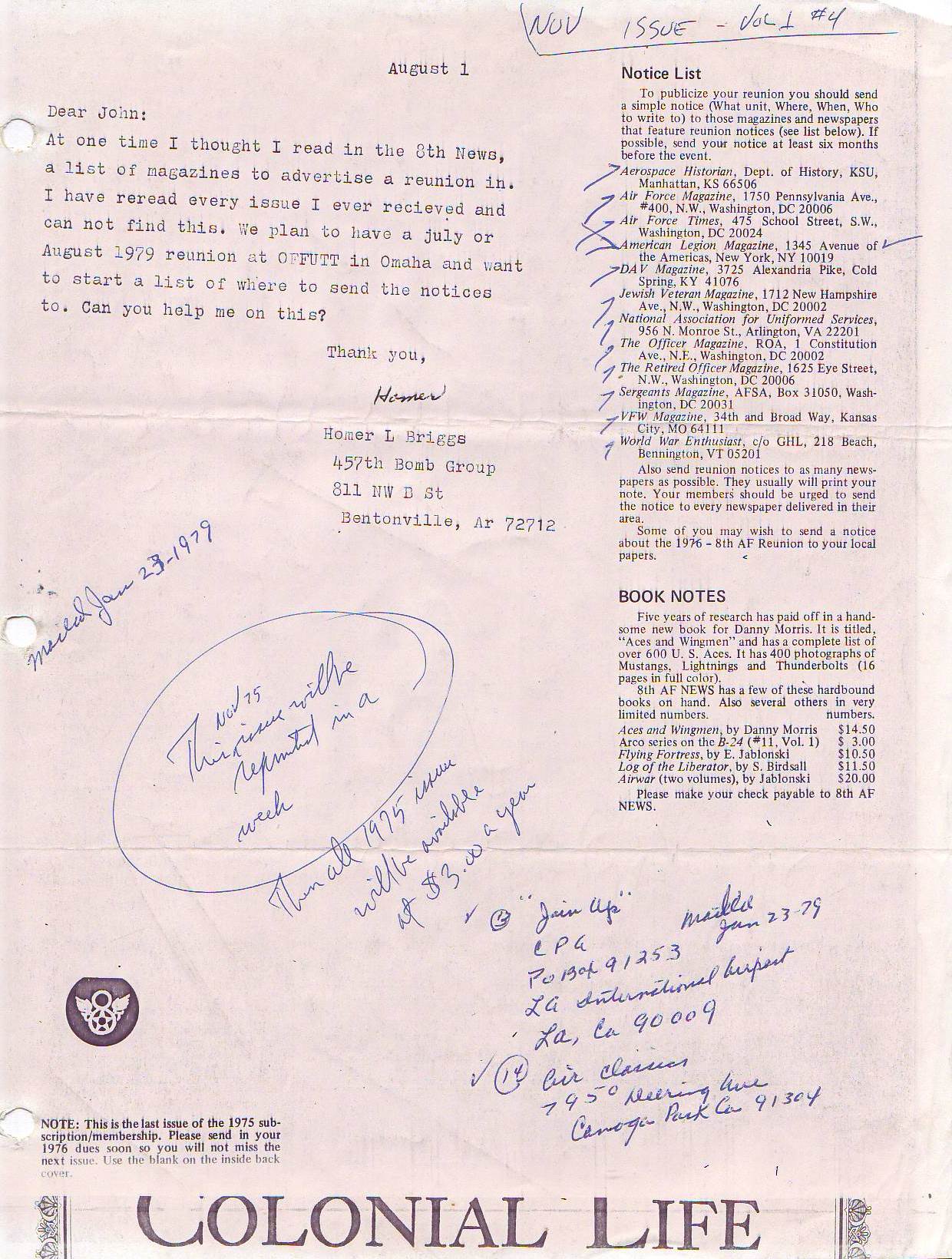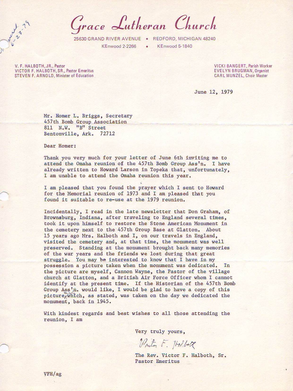 Reunion 1979 Reunion program Reunion attendees Center piece Ken Kinyon 749th men 749th men Banquet Poem Victor F. Halboth Reunion prayer Honor ceremony Group photo 748th men Peterson and Sellon Group photo 749th men Reunion banquet Townsends and Carey Homer Briggs 457th BG women Homer Briggs Holiday Inn flyer Holiday Inn flyer Holiday Inn flyer Holiday Inn flyer Holiday Inn flyer Strategic Aerospace Museum Strategic Aerospace Museum Strategic Aerospace Museum Strategic Aerospace Museum Baines letter part 1 Baines letter part 2 Brown’s cancellation Reunion notices Reunion notices The American Legion The American Legion V.F.W. Magazine Reunion notice DAV Magazine Air Force Historical Foundation Magazine leaflets